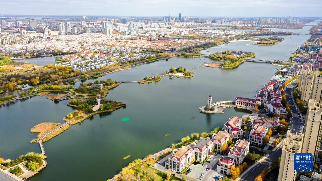 東營(yíng)市明月湖國家城市濕地公園景色(11月13日攝,無(wú)人機照片)。