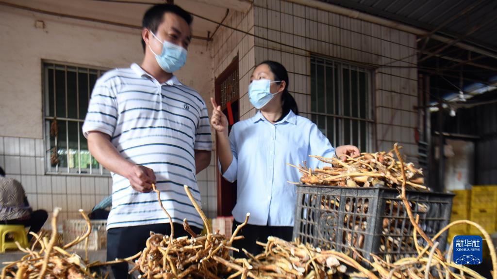 在欽州市欽北區貴臺鎮百美村委那疋村,利遠遠(右)在了解農產(chǎn)品銷(xiāo)售問(wèn)題(11月13日攝)。