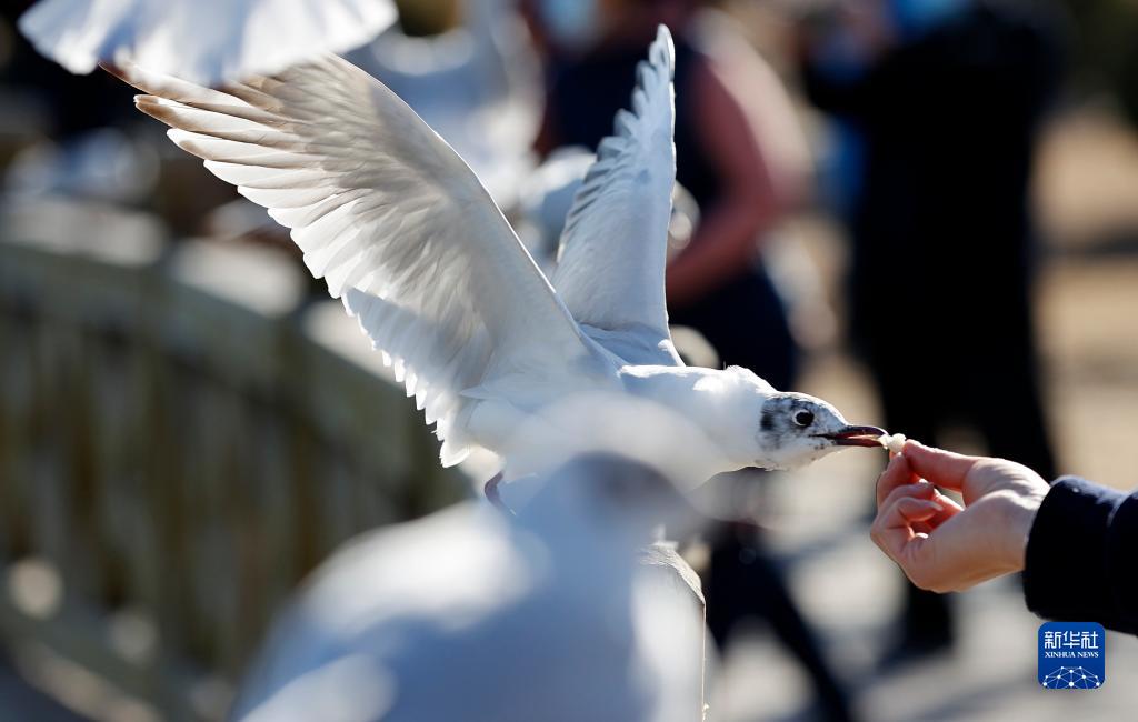 2020年3月14日,市民在寧夏銀川市海寶公園喂食紅嘴鷗。