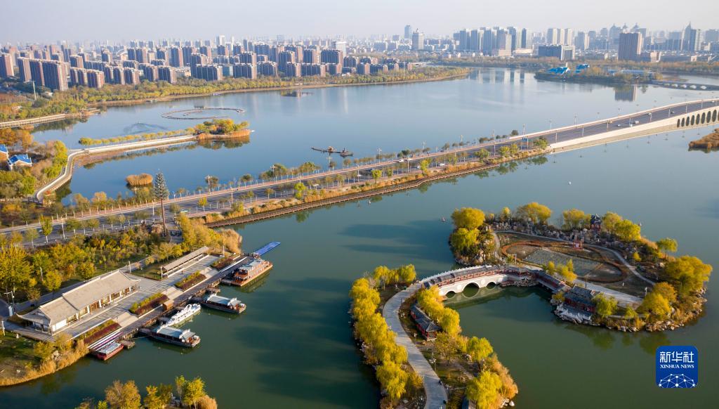 寧夏銀川市閱海國家濕地公園一景(2022年11月1日攝,無(wú)人機照片)。
