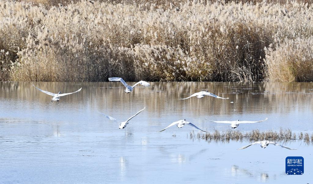 天鵝在密云水庫流域的清水河上飛翔(11月15日攝)。