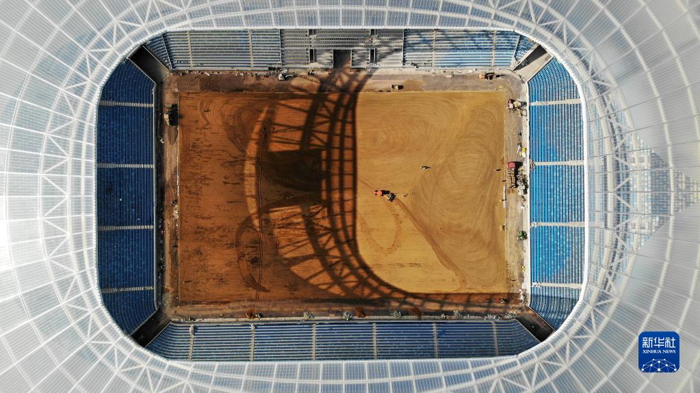 青島青春足球場(chǎng)內場(chǎng)在進(jìn)行場(chǎng)地平整施工(11月16日攝,無(wú)人機照片)。