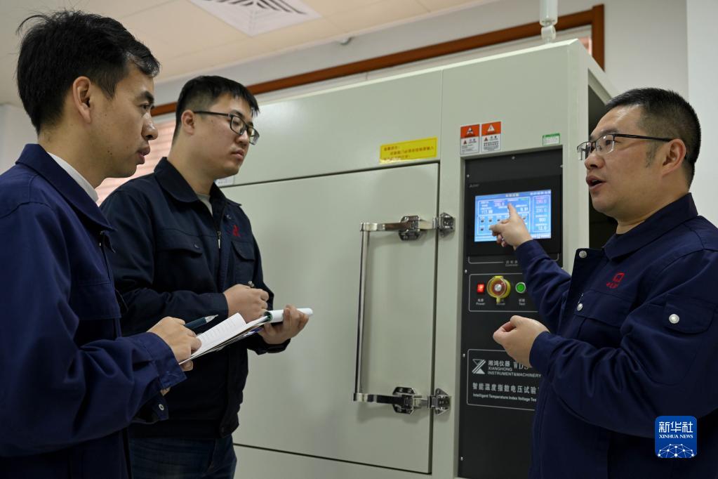 11月16日,在位于安徽省銅陵市的銅陵精達特種電磁線(xiàn)股份有限公司實(shí)驗室,蘇保信(右)為工作人員講解熱老化耐壓試驗儀的操作規程。