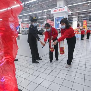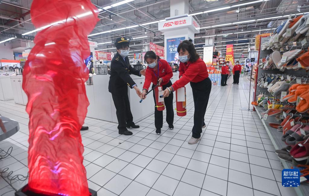 11月17日,龍泉街道應急管理中心工作人員指導一家超市員工使用滅火器。