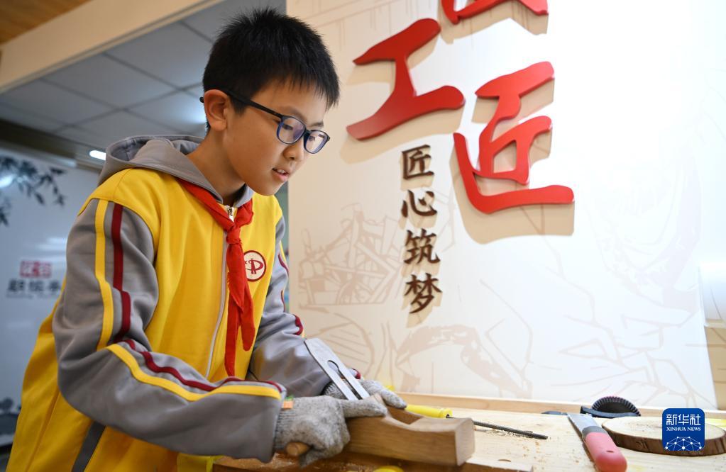 11月17日,天津市和平區中心小學(xué)的學(xué)生在上木工課。
