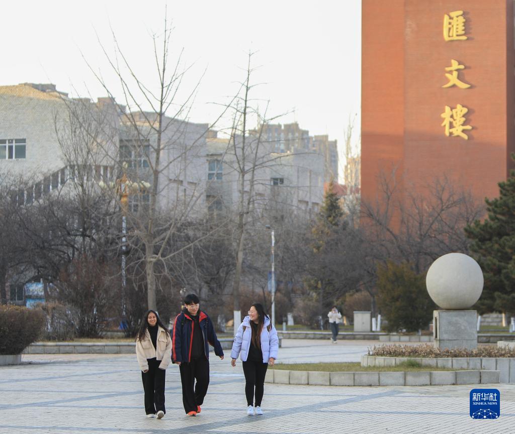 11月16日,白書(shū)晴(左)、李文龍(中)和明亮在校園內散步。