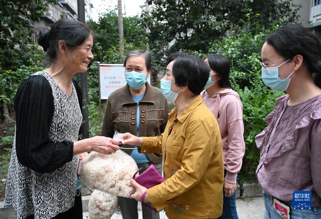 11月18日,林丹(中)與社區干部為軍門(mén)社區老人送繡球菌。