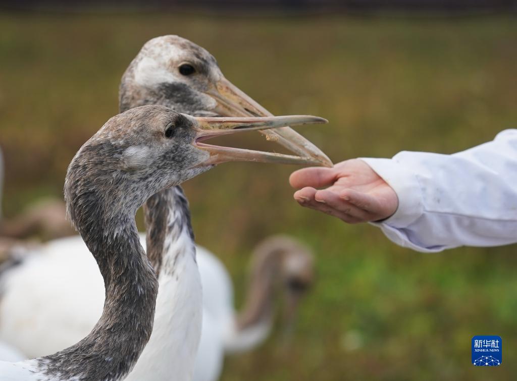 保護區馴養員在江蘇鹽城濕地珍禽國家級自然保護區與人工繁育的丹頂鶴互動(dòng)(11月8日攝)。