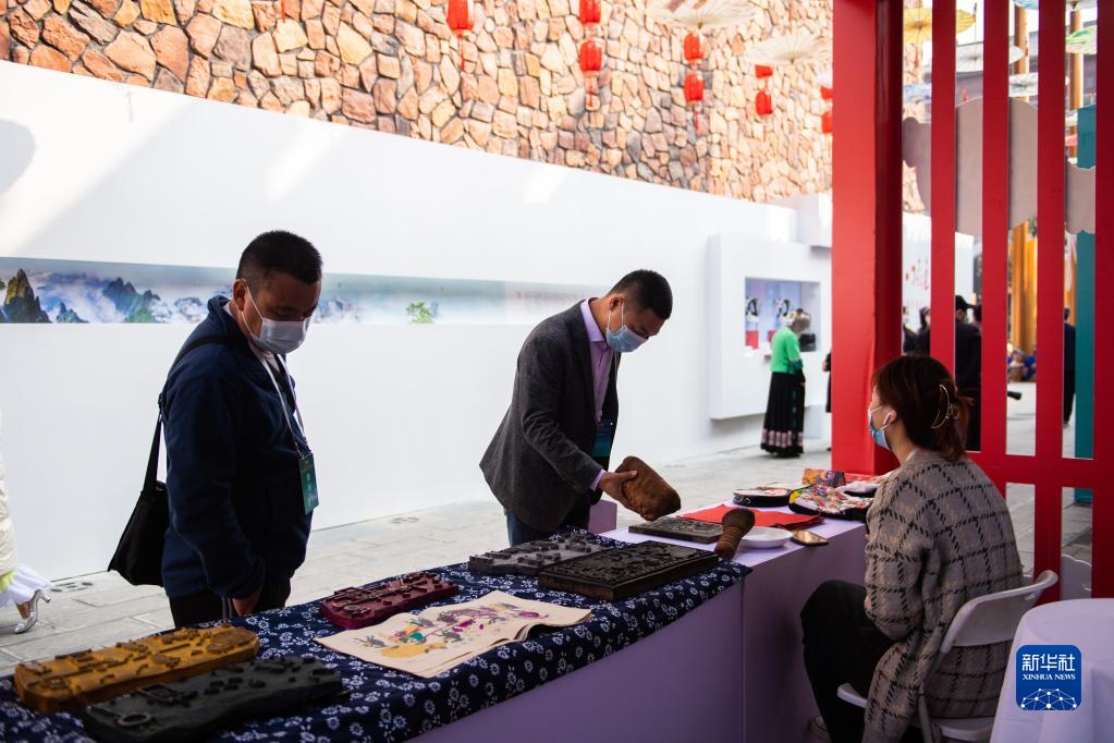 11月19日,游客在張家界大庸古城湖南首屆非遺博覽會(huì )現場(chǎng)挑選非遺商品。