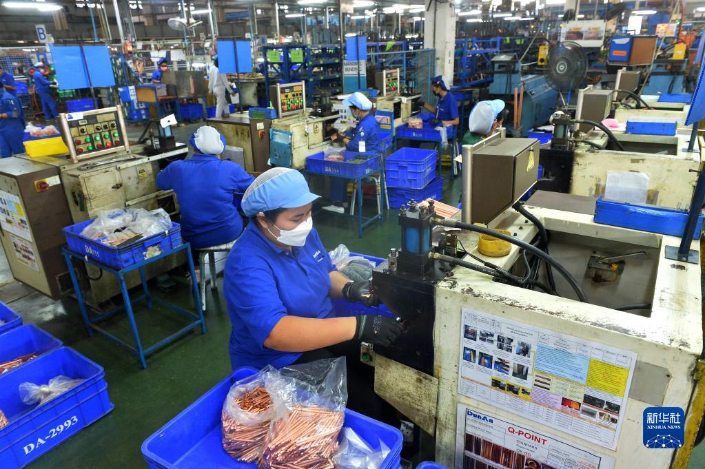 11月8日,在位于泰國羅勇府的泰中羅勇工業(yè)園,工人在盾安金屬(泰國)有限公司生產(chǎn)線(xiàn)上工作。