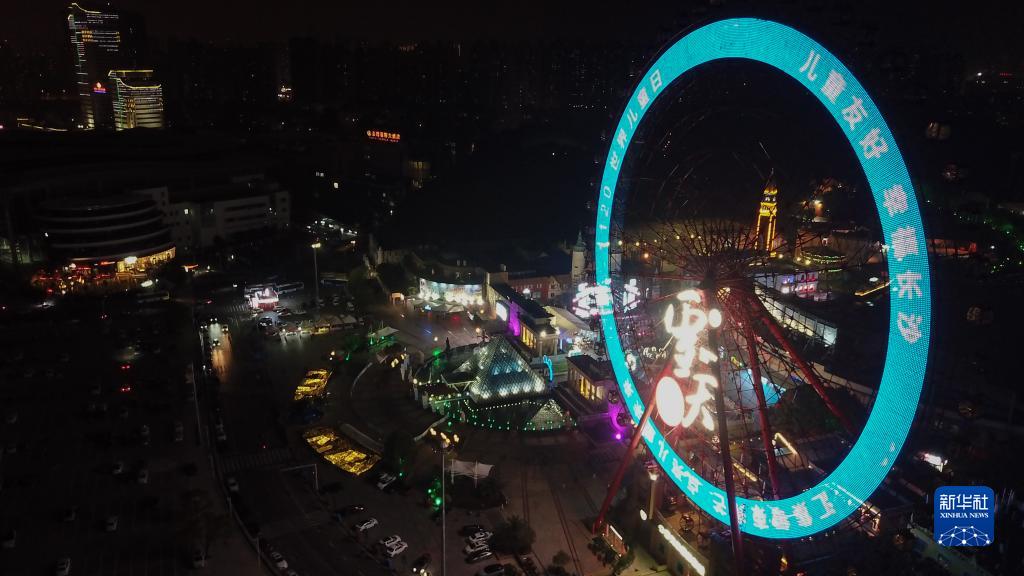 11月20日,長(cháng)沙世界之窗的摩天輪為世界兒童日亮燈(無(wú)人機照片)。