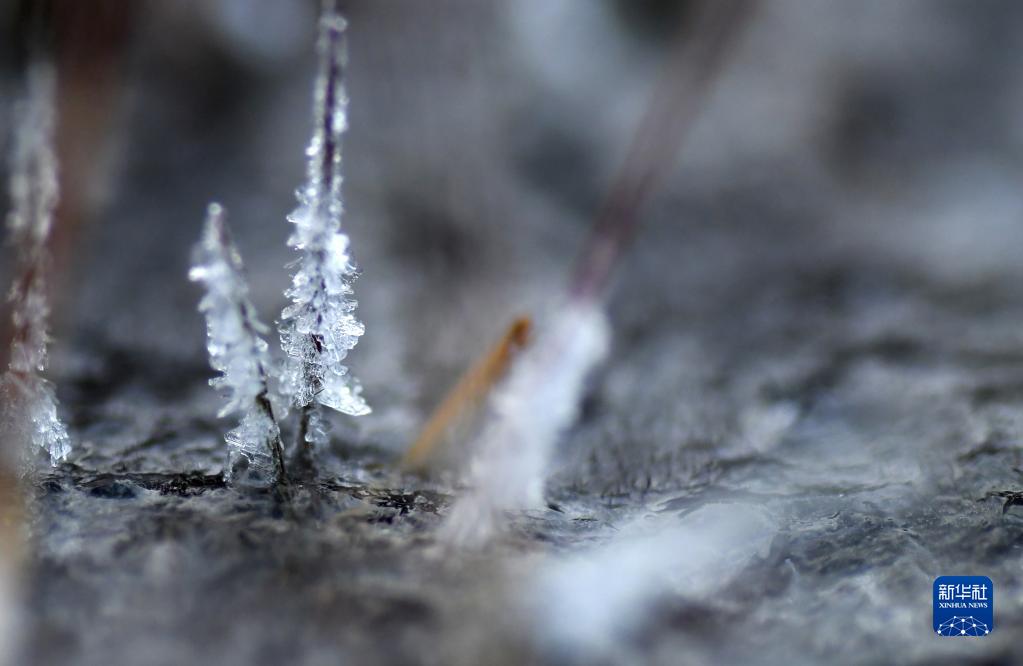 11月13日,在云南省迪慶藏族自治州香格里拉市納帕海,湖面上的水草結了冰。
