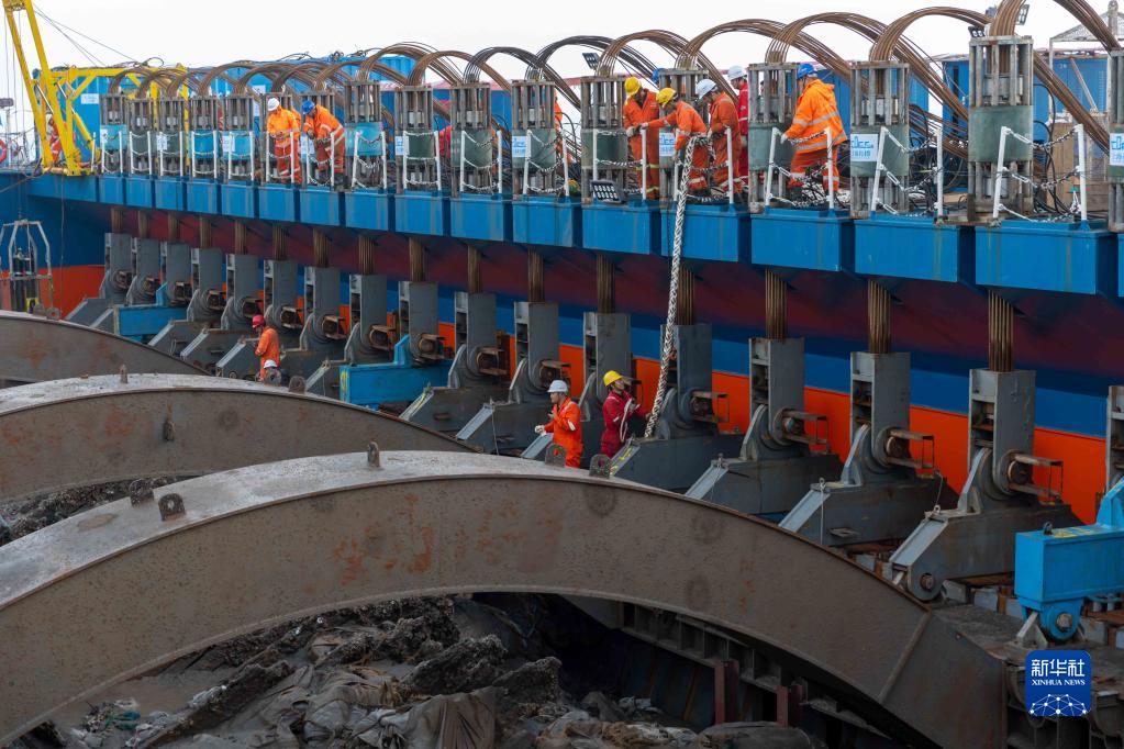采用世界首創(chuàng )的“弧形梁非接觸文物整體遷移技術(shù)”, 我國迄今水下考古發(fā)現的體量最大的木質(zhì)沉船——長(cháng)江口二號古船21日在長(cháng)江口水域成功實(shí)施整體打撈。隨著(zhù)打撈進(jìn)展有序推進(jìn),21日清晨,長(cháng)江口二號古船船體已局部露出水面,初露真容。