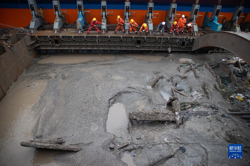 采用世界首創(chuàng )的“弧形梁非接觸文物整體遷移技術(shù)”, 我國迄今水下考古發(fā)現的體量最大的木質(zhì)沉船——長(cháng)江口二號古船21日在長(cháng)江口水域成功實(shí)施整體打撈。隨著(zhù)打撈進(jìn)展有序推進(jìn),21日清晨,長(cháng)江口二號古船船體已局部露出水面,初露真容。