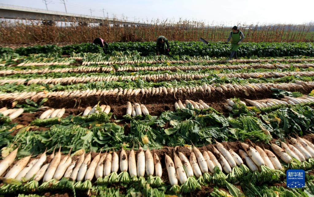11月20日,在山東省臨沂市平邑縣地方鎮東朱尹村,農民在田間收獲白蘿卜。