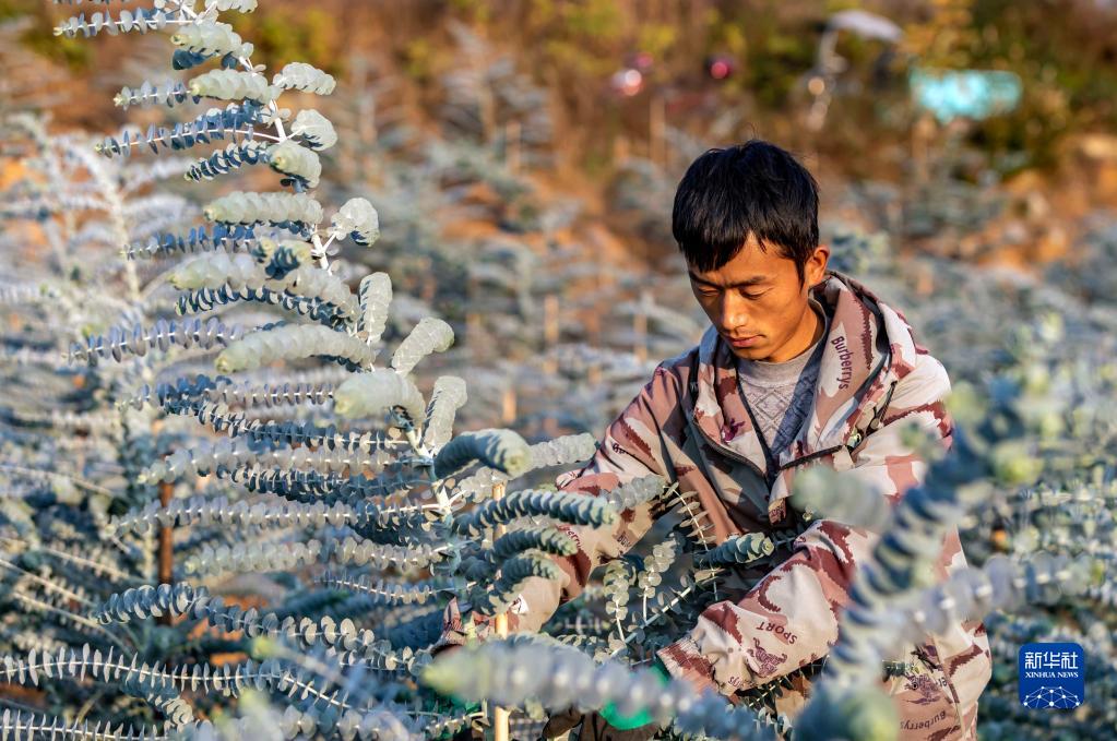 11月20日,村民在貴州省黔西市蓮城街道老鴰河社區花卉基地采收尤加利。
