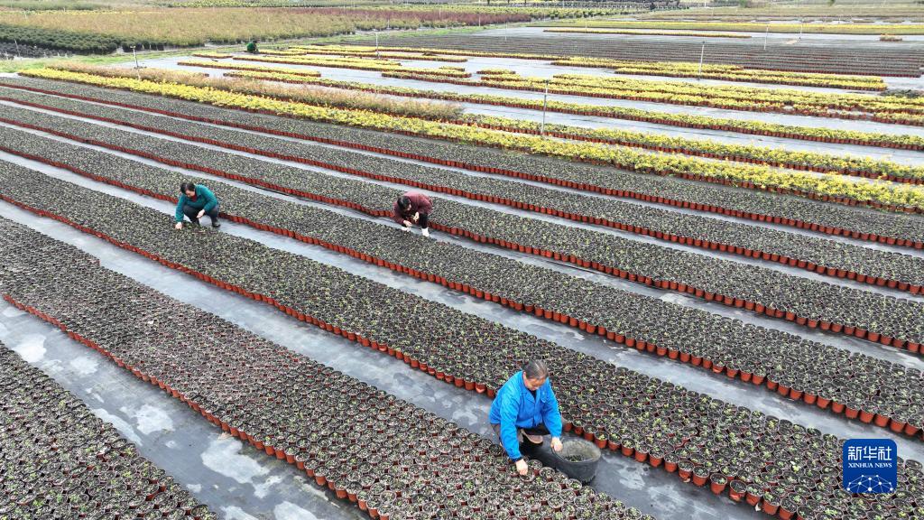 11月20日,在浙江省湖州市德清縣莫干山鎮高峰村千畝苗木種植基地,農民在管護苗木(無(wú)人機照片)。