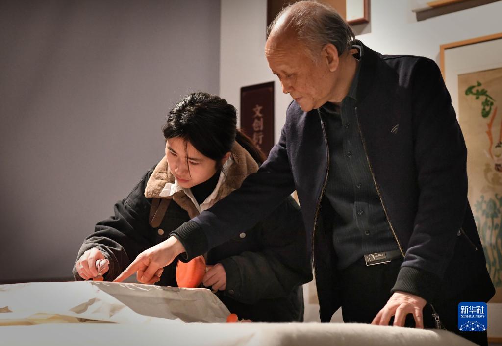 在鄭州商都遺址博物院臨時(shí)展廳里的體驗區,李仁清指導學(xué)員撲墨(11月17日攝)。