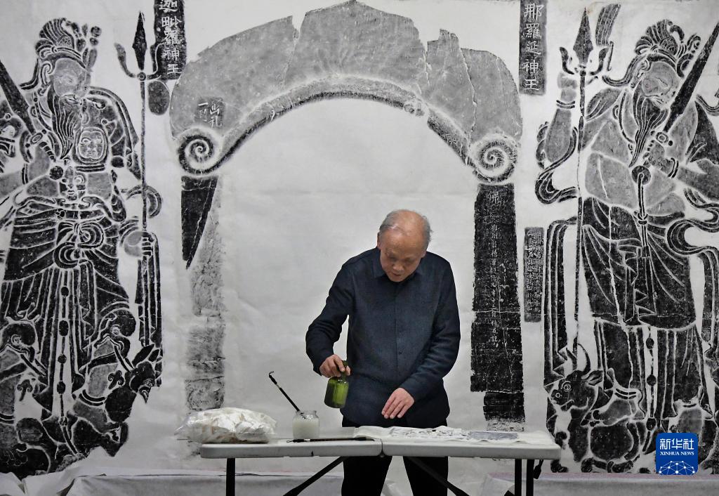 上紙、噴濕、剪紙、砸刷、晾干、撲墨、粘接、修復……一系列流程下來(lái),立體石雕磚上的雕像就纖毫畢現地展露在平面拓片之上,59歲的李仁清拿起拓片仔細地檢查著(zhù)每一處細節。