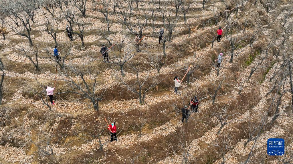 11月22日,河北省遵化市侯家寨鄉禪林寺村,農民在栗樹(shù)果園剪枝(無(wú)人機照片)。