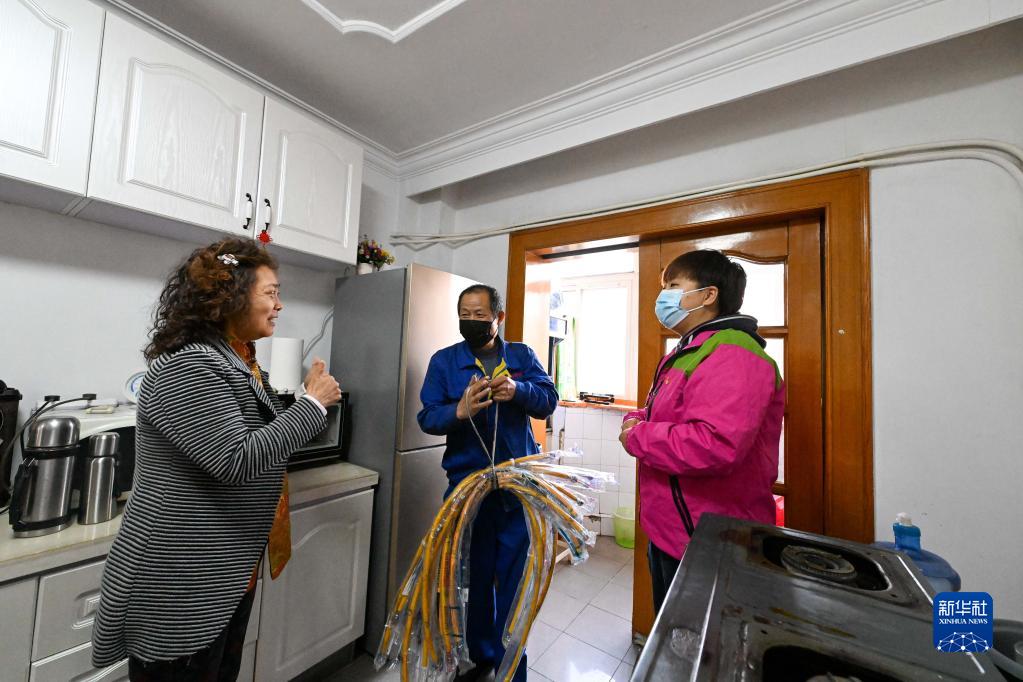 11月22日,在天津市河西區越秀路街道港云里社區,社區黨委副書(shū)記、網(wǎng)格員李想(右)入戶(hù)查看居民家中燃氣管道更換進(jìn)展。