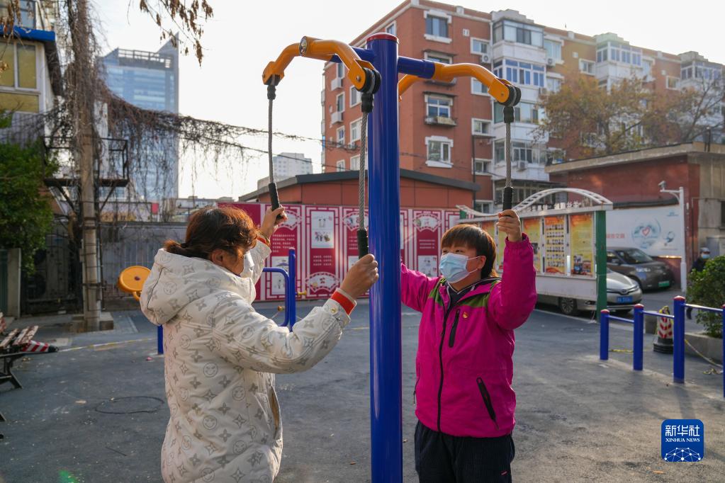 11月22日,在天津市河西區越秀路街道港云里社區,社區黨委副書(shū)記、網(wǎng)格員李想(右)在戶(hù)外與晨練的居民交流。