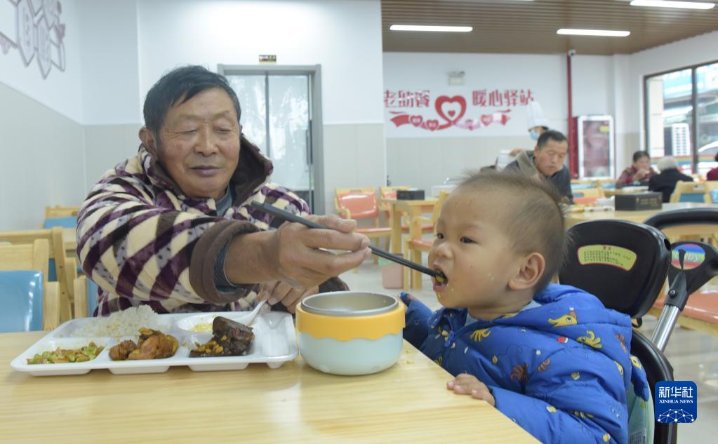 11月22日,安徽省合肥市肥東縣老年助餐服務(wù)中心內,老人鄒幫友(左)帶著(zhù)孫子就餐。