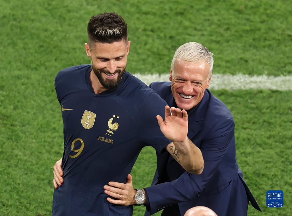 11月22日,法國隊球員吉魯(左)被換下后與主教練德尚互動(dòng)。