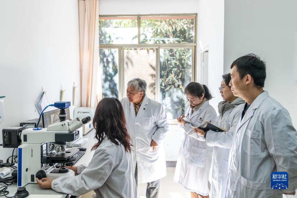 11月22日,朱兆云(左二)在云南省藥物研究所實(shí)驗室指導學(xué)員做研究。