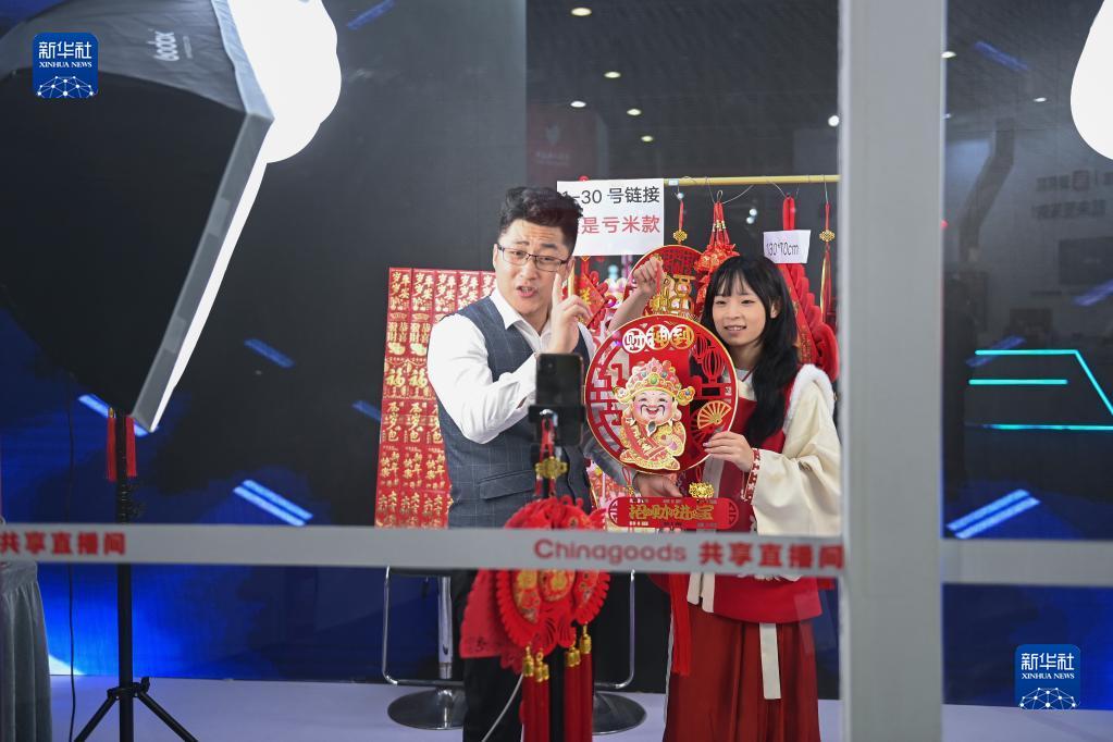 11月24日,參展商在義烏市場(chǎng)建設40周年主題館的“共享直播間”展區進(jìn)行直播帶貨。