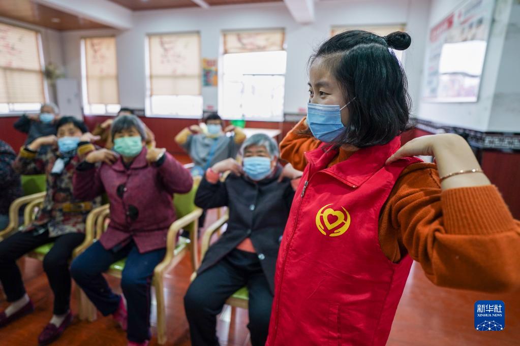 在鹽城市亭湖區大洋街道綜合養老服務(wù)中心,工作人員帶領(lǐng)老人鍛煉身體(11月23日攝)。