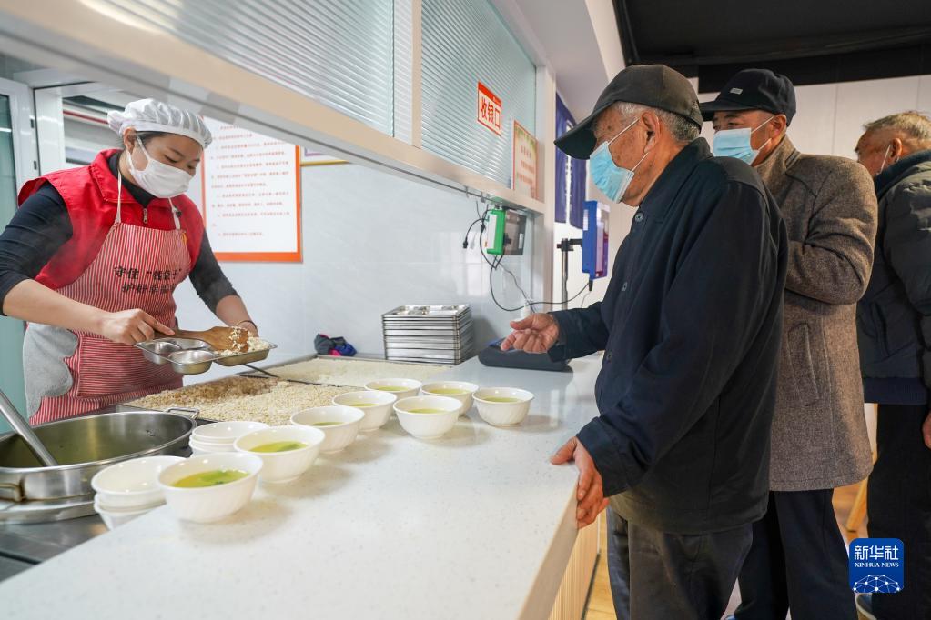 11月24日,在鹽城市亭湖區五星街道萬(wàn)戶(hù)新村長(cháng)者幸福食堂,工作人員在為老人打飯。