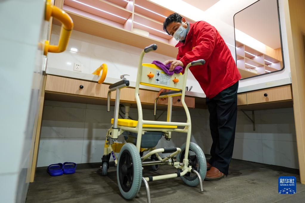 在鹽城市亭湖區五星街道萬(wàn)戶(hù)新村老年助浴服務(wù)中心,工作人員在清潔洗浴間內的助老設備(11月23日攝)。