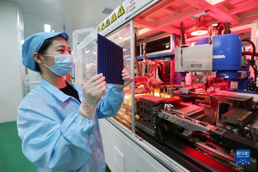 11月24日,在淮北市烈山經(jīng)濟開(kāi)發(fā)區一家光伏面板生產(chǎn)企業(yè)車(chē)間,工人在查看產(chǎn)品質(zhì)量。