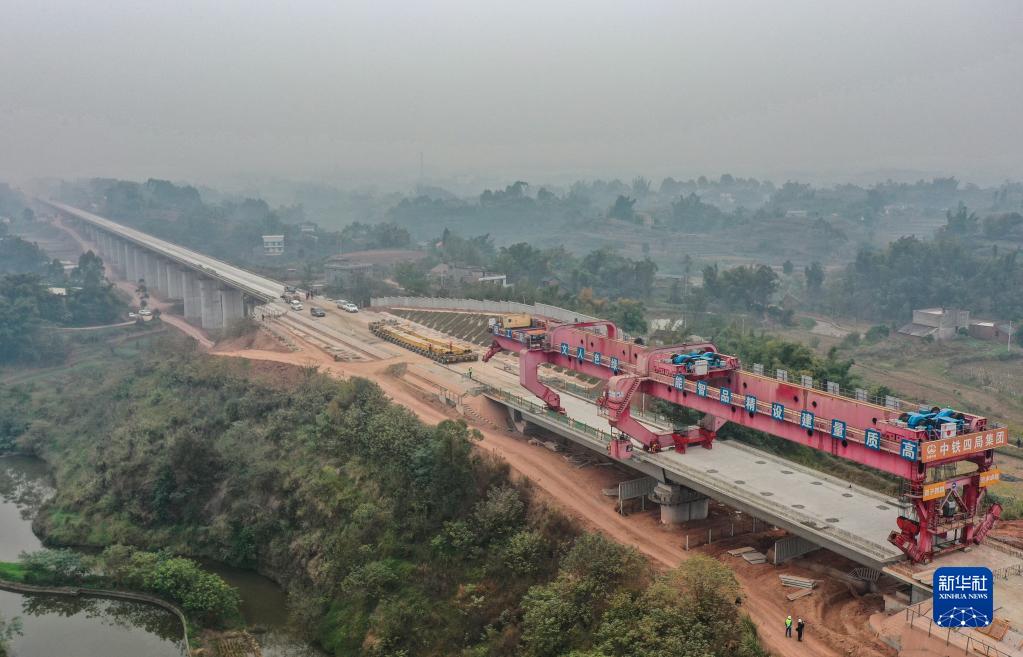 這是11月24日拍攝的渝昆高鐵瀘宜段架梁施工現場(chǎng)(無(wú)人機照片)。