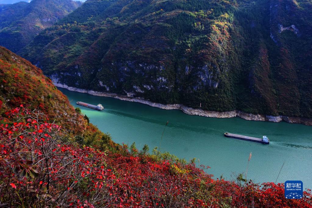 11月24日,輪船航行在紅葉映襯下的長(cháng)江巫峽水域。