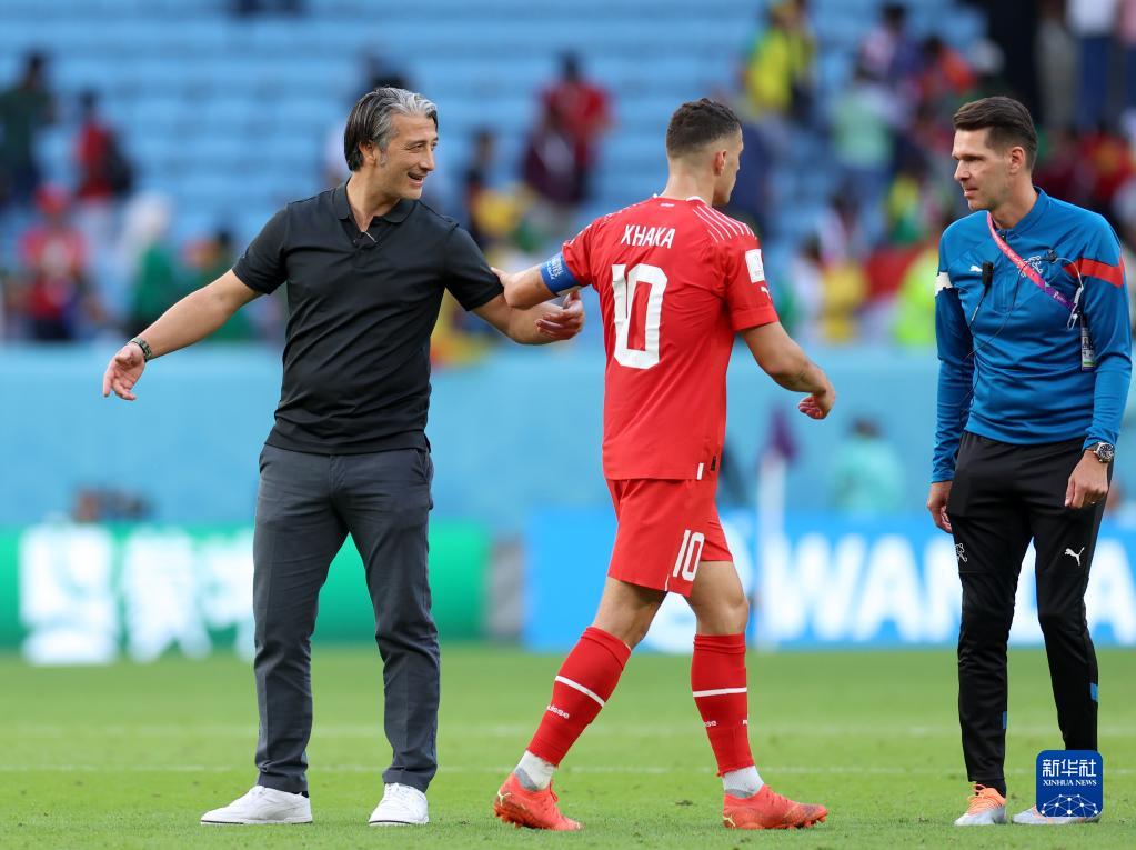11月24日,瑞士隊主教練穆拉特·亞金(左)與球員扎卡(中)在比賽后。