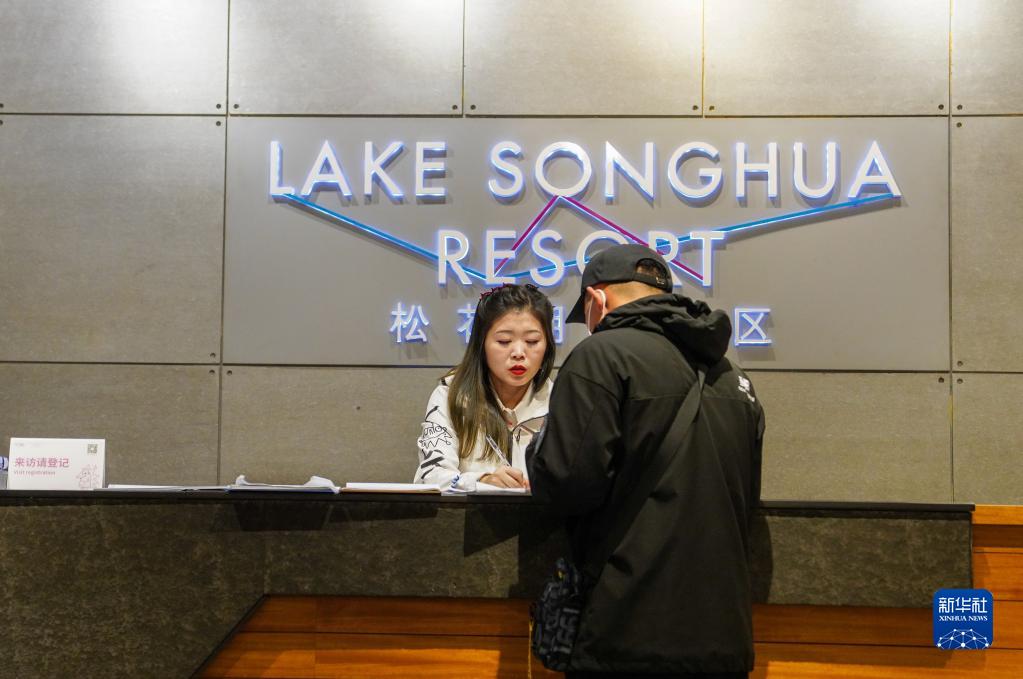 王爽(左)在吉林市萬(wàn)科松花湖度假區前臺與客人交流(11月20日攝)。吉林市萬(wàn)科松花湖度假區的前臺接待人員王爽家住在滑雪場(chǎng)山腳下的豐滿(mǎn)區段吉村。三年前,她辭去了在城里的工作,選擇來(lái)到距家里只有7公里的滑雪場(chǎng)工作?!氨┊a(chǎn)業(yè)前景廣闊,能把我們留在家鄉?!蓖跛f(shuō)。
