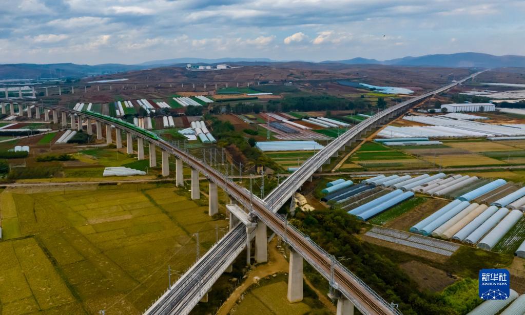 11月24日,列車(chē)行駛在中越國際通道昆明至河口鐵路,下層為彌蒙高鐵線(xiàn)(無(wú)人機照片)。