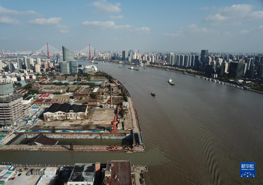 上海船廠(chǎng)舊址1號船塢已打開(kāi)閘門(mén),完成灌水,靜候長(cháng)江口二號古船(無(wú)人機照片,11月24日攝)。