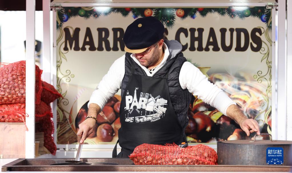 11月24日,商販在法國巴黎杜伊勒里花園的圣誕市場(chǎng)售賣(mài)熱栗子。