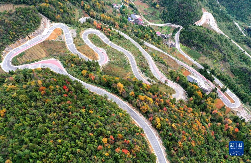 這是宣恩縣椒園鎮黃坪村的山間公路景色(11月24日攝,無(wú)人機照片)。