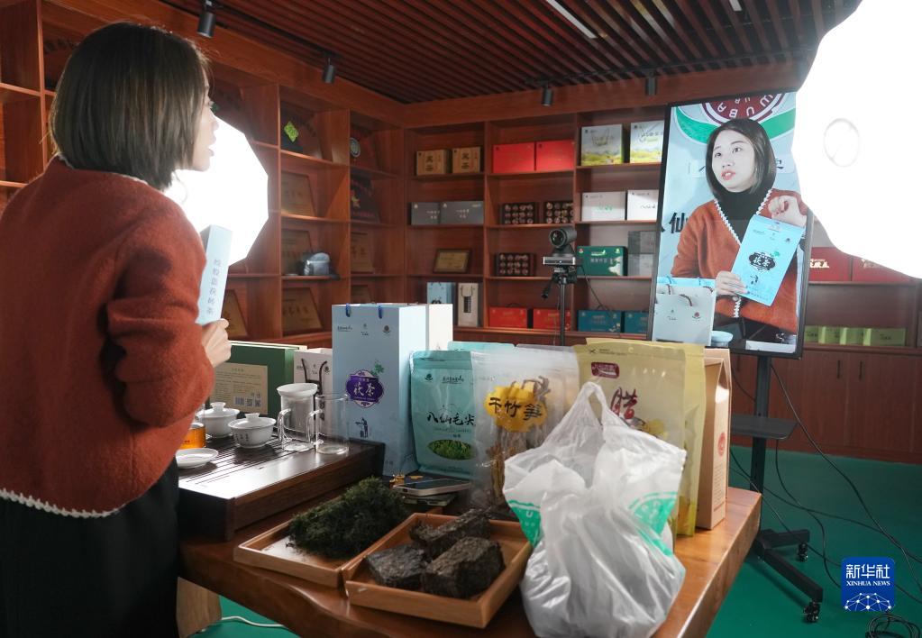 在陜西安康市平利縣八仙鎮一家茶葉公司,電商主播在介紹茶葉產(chǎn)品(10月21日攝)。