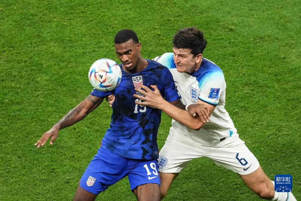 11月25日,美國隊球員哈吉·賴(lài)特(左)與英格蘭隊球員馬奎爾在比賽中拼搶。