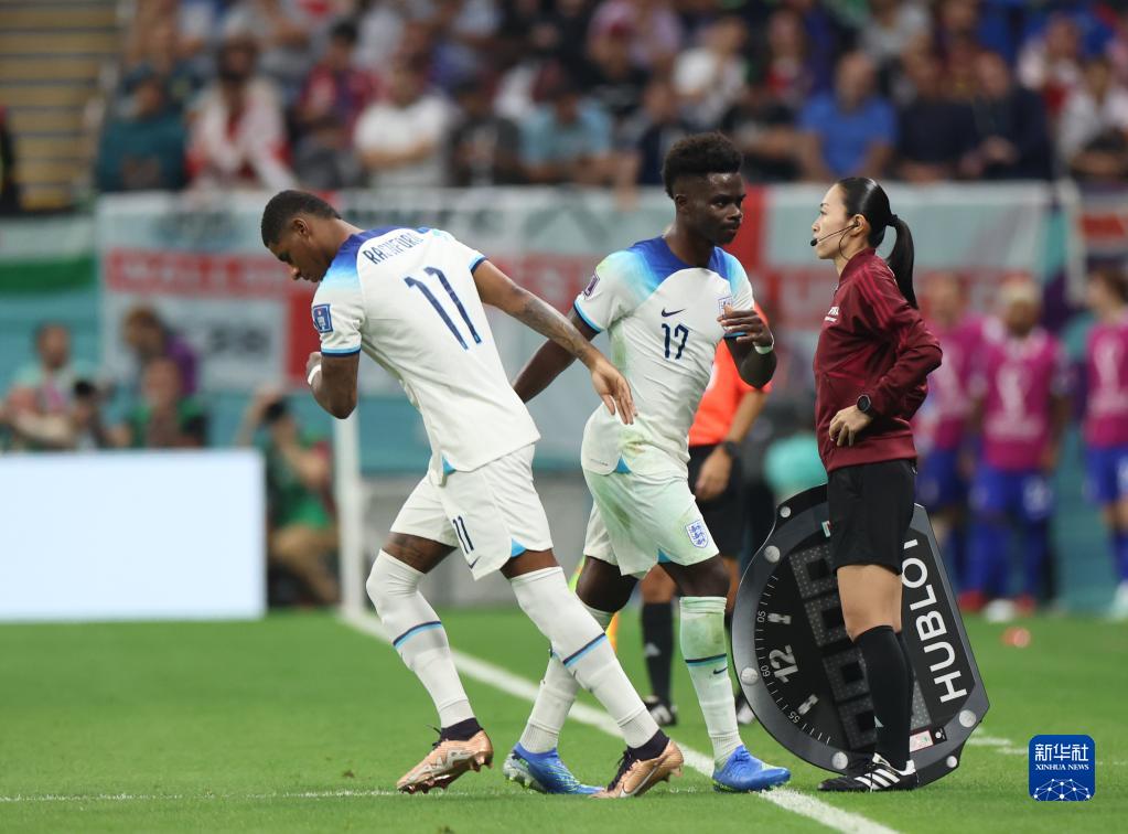 11月25日,英格蘭隊球員拉什福德(左)在比賽中替換隊友薩卡(中)登場(chǎng)。