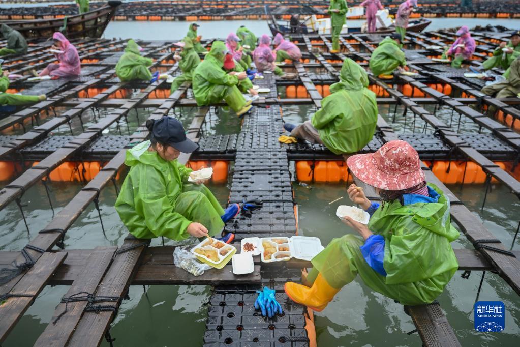 11月25日,在福州連江縣苔菉鎮后灣海域,漁民在漁排上吃午飯。