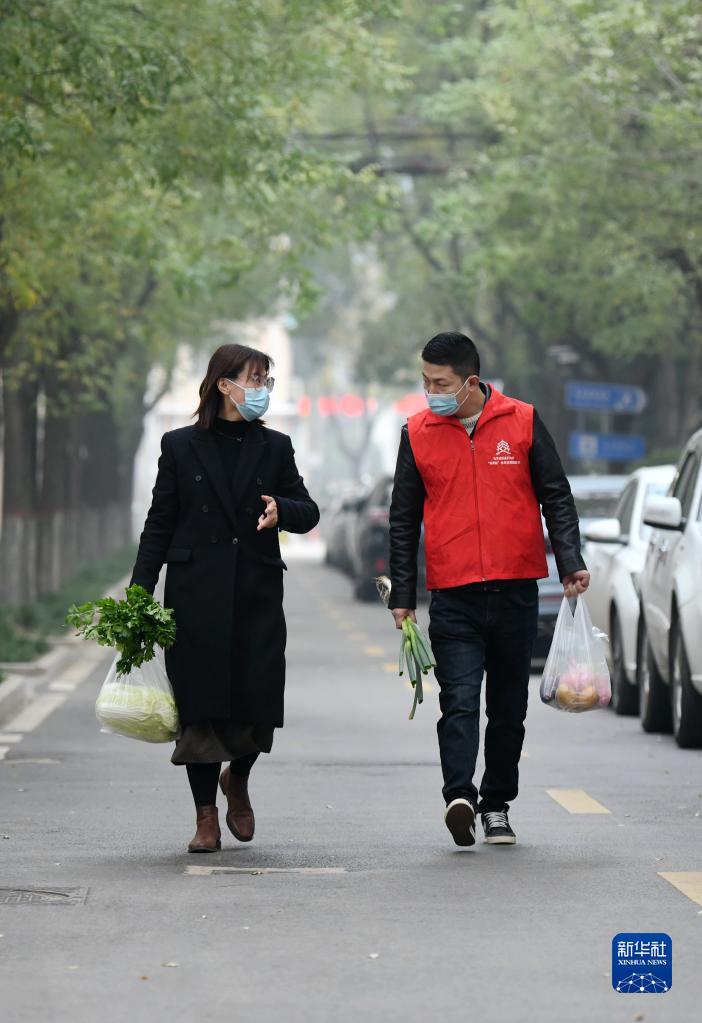 11月17日,西安市雁塔區電子城街道二〇五所社區黨支部書(shū)記于珍(左)和志愿者薛亞洲帶著(zhù)蔬菜上門(mén)探望社區老人。