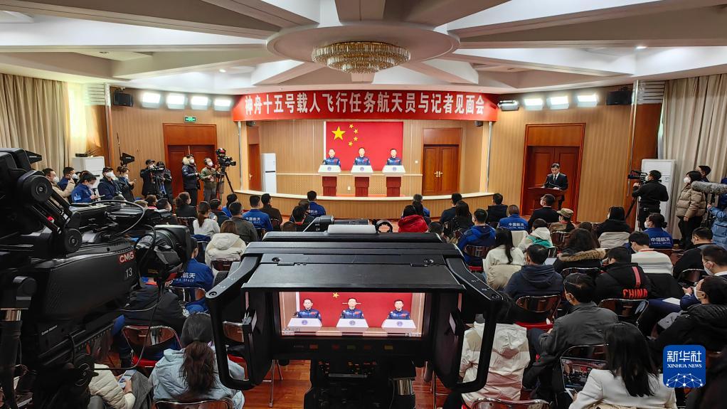 11月28日,執行神舟十五號載人飛行任務(wù)的航天員乘組費俊龍、鄧清明、張陸在酒泉衛星發(fā)射中心問(wèn)天閣與中外媒體記者集體見(jiàn)面,并回答記者提問(wèn)。