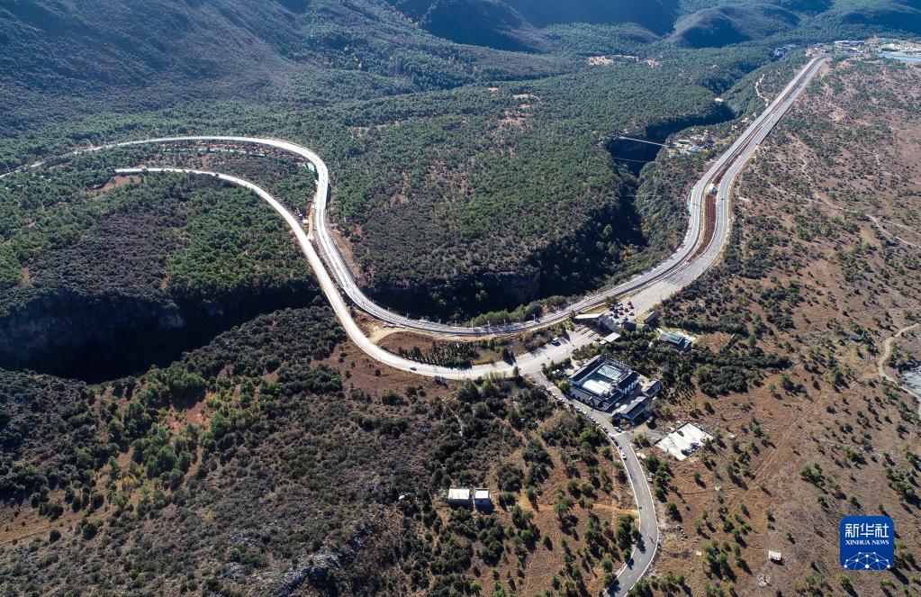 這是11月28日拍攝的麗江觀(guān)光火車(chē)一期工程玉龍雪山景區入口處的鐵路線(xiàn),與旅游環(huán)線(xiàn)并行(無(wú)人機照片)。