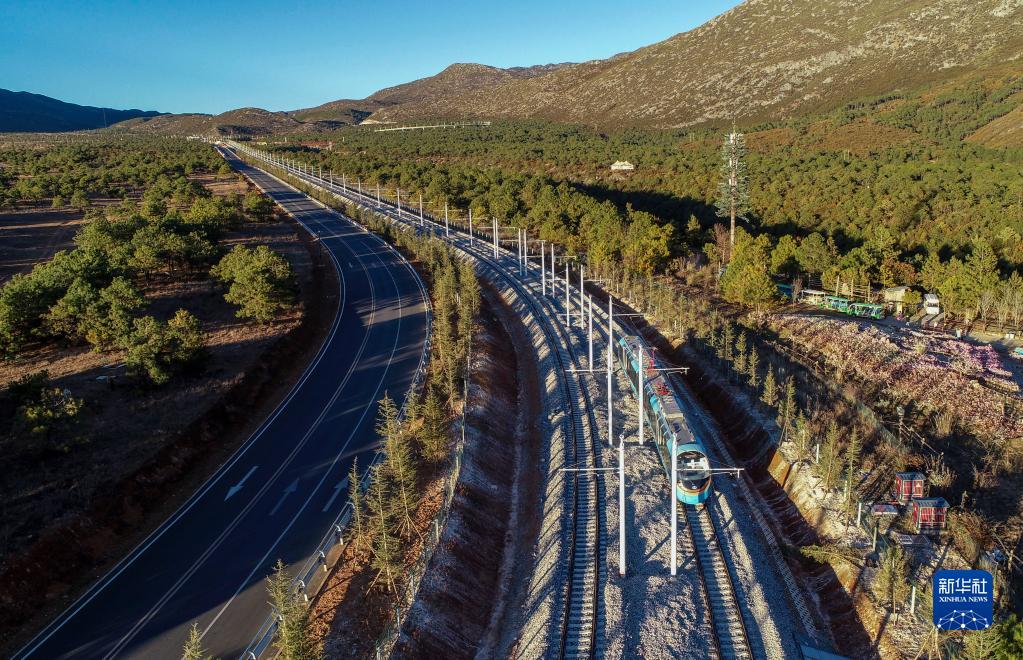 11月27日,觀(guān)光火車(chē)行駛在麗江觀(guān)光火車(chē)一期工程鐵路線(xiàn)上(無(wú)人機照片)。